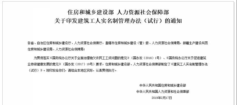 3月1日起,《建筑工人實名制管理辦法(試行)》開始施行。全面實行建筑業(yè)農(nóng)民工實名制管理制度。建筑企業(yè)應與聘用的建筑工人依法簽訂勞動合同,對其進行基本安全培訓,并在相關建筑工人實名制管理平臺上登記,方可允許其進入施工現(xiàn)場從事與建筑作業(yè)相關的活動。